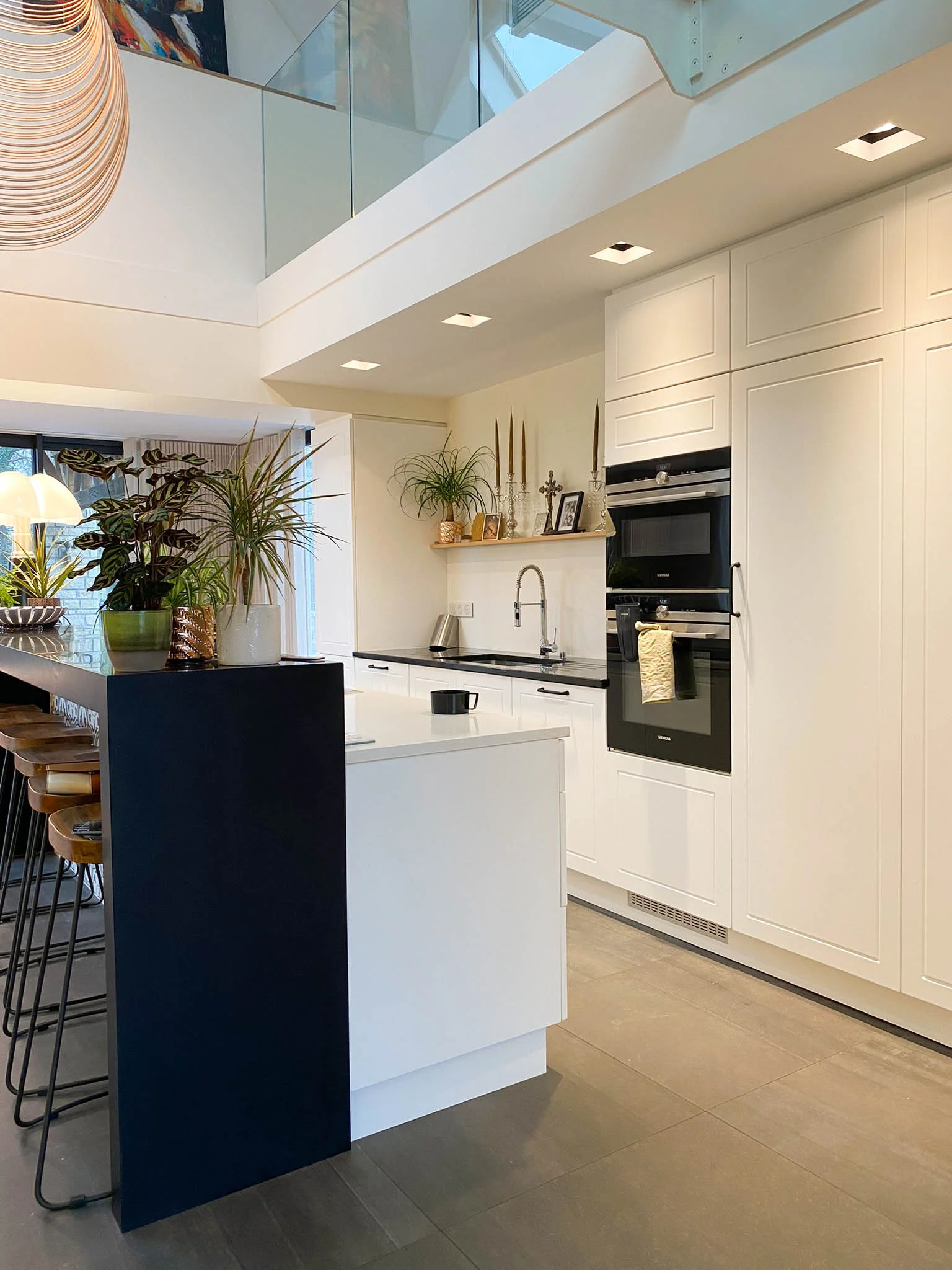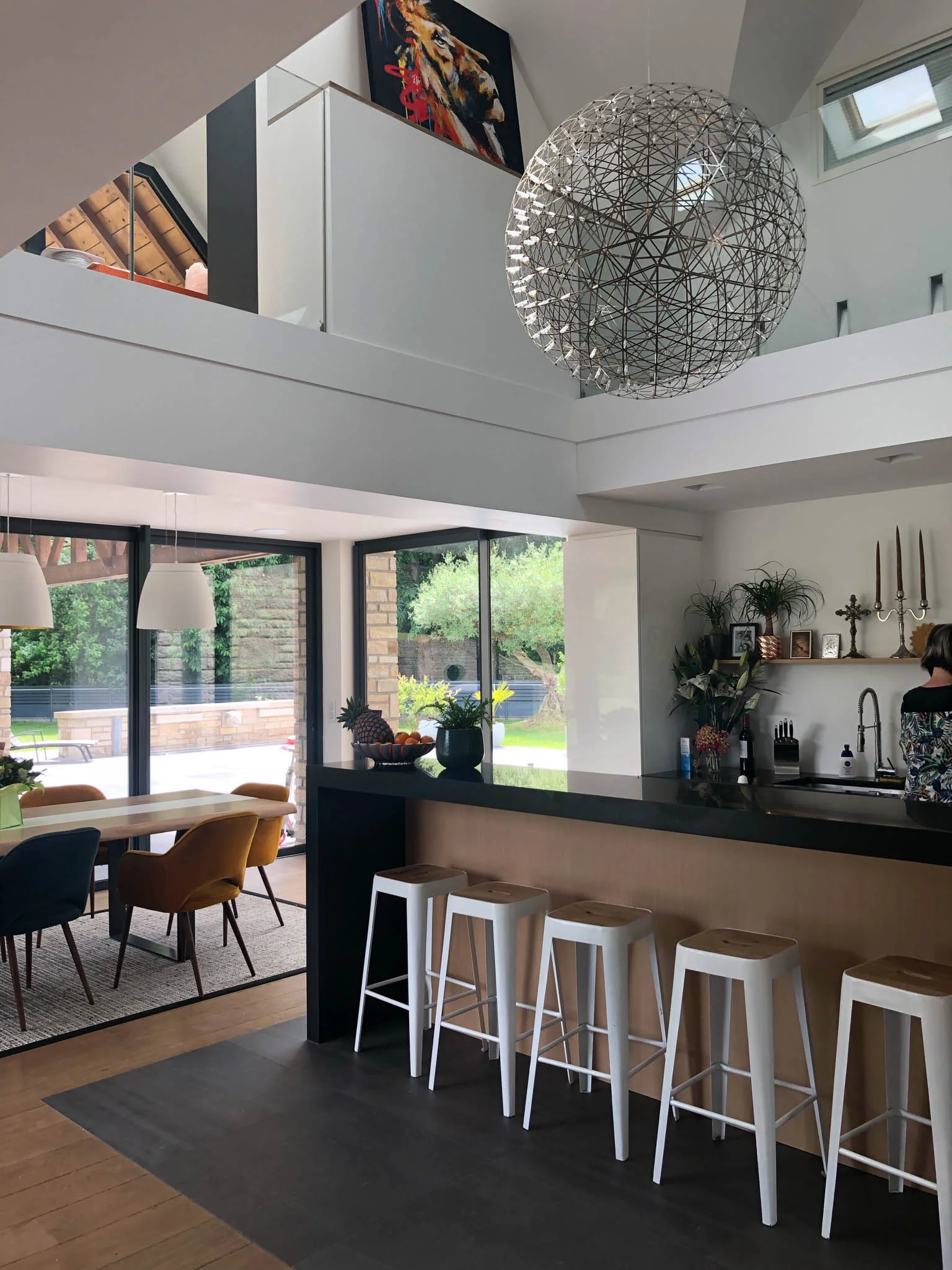 Pour ce chouette projet, j’ai fait un peu de route depuis Rennes, pour me rendre à Quimperlé, pour la rénovation de la grande pièce de vie d’une maison familiale finistérienne. Mon client a fait appel à moi pour la création d’une nouvelle ambiance plus chaleureuse pour son grand espace de vie, mais aussi pour la chambre de sa suite parentale, mais ça je vous en parle dans un sujet à part. J’ai repensé les matériaux, les couleurs, les matières et dessiné, puis fait fabriquer, plusieurs éléments de menuiserie sur-mesure ! Un hall d’entrée, une cuisine et son grand mange-debout, une salle-à-manger et un séjour, sont les différents espaces que j’ai traités et que j’ai harmonisés entre eux dans cette grande pièce ouverte sur l’extérieur.