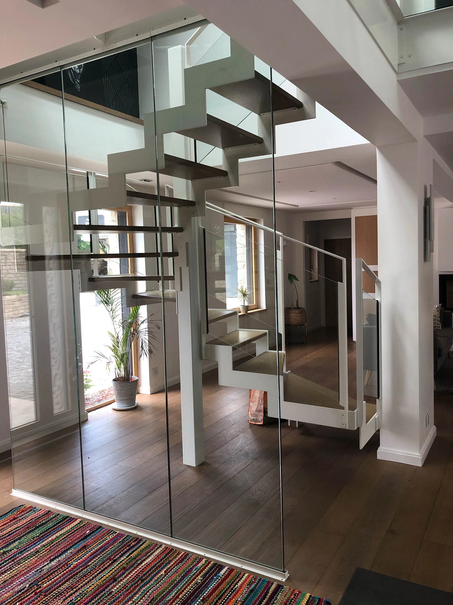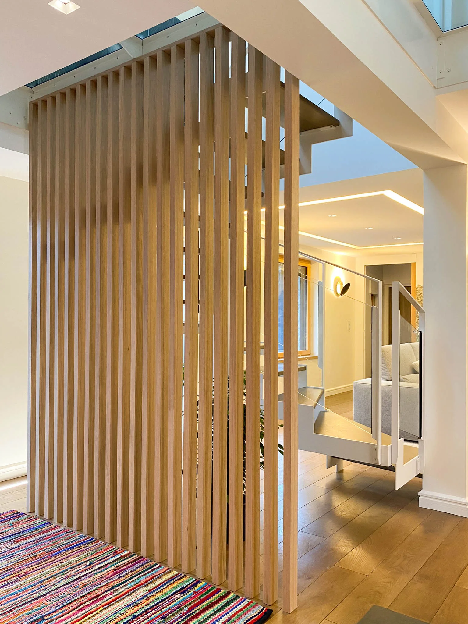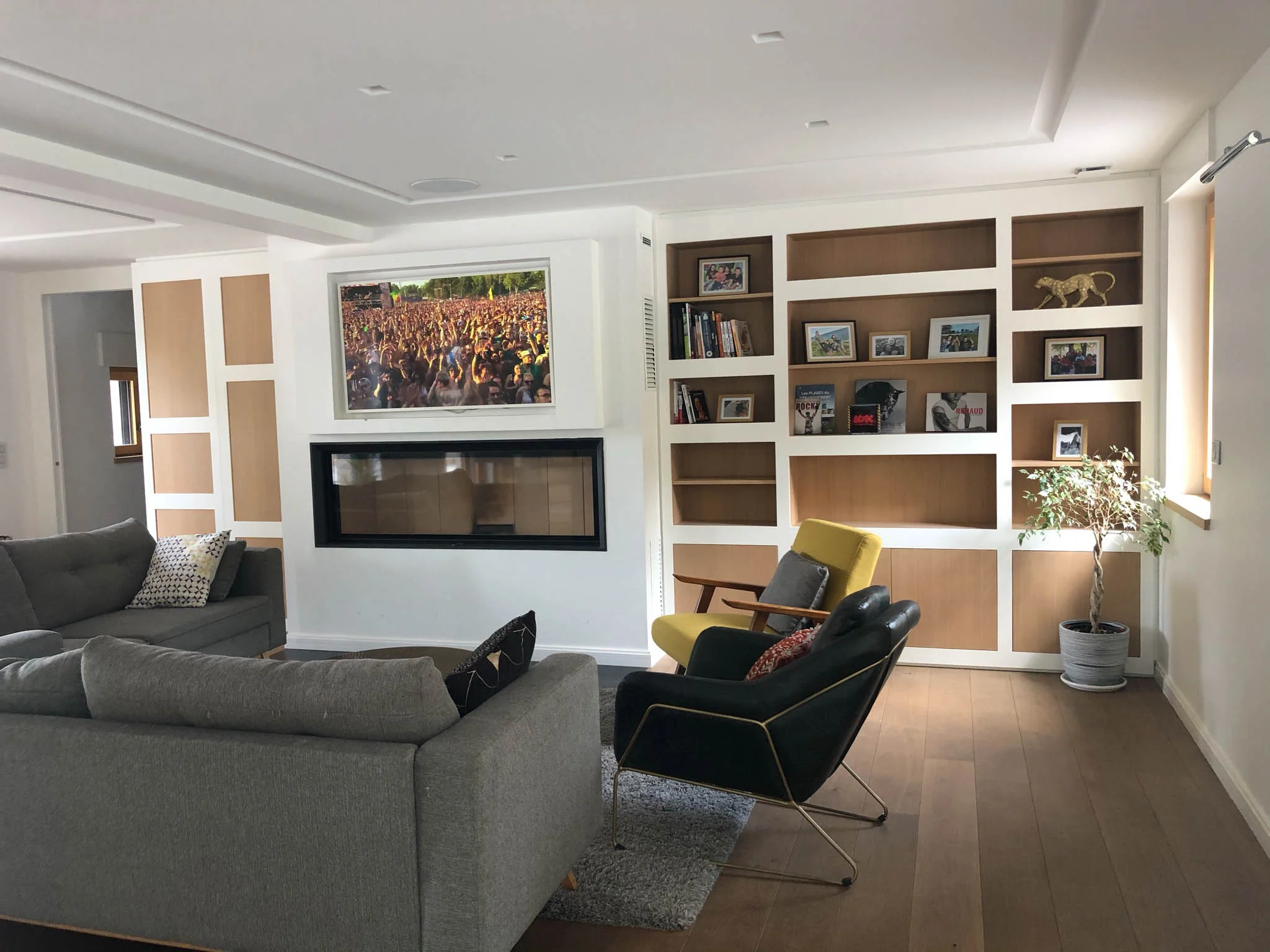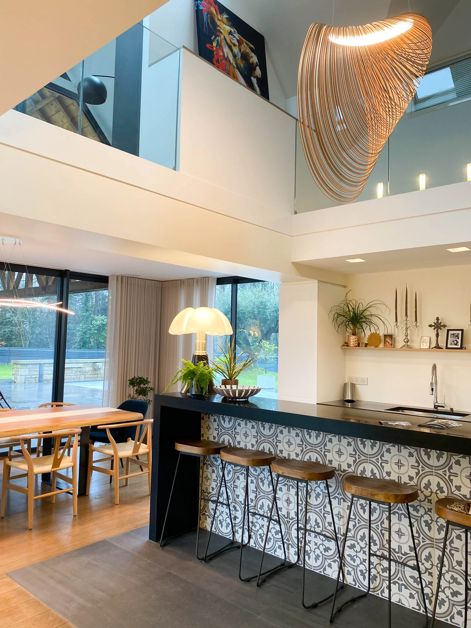 Du bois, des nuances de beiges, des matières douces, des matériaux de qualité et de jolis luminaires à la fois design et intemporels, sont les éléments pour lesquels j’ai opté pour ce bel intérieur. Mon client a eu un réel coup de cœur pour ce décor mural végétal et pour l’ajout de rideaux, en tissu imitation lin, dans sa salle-à-manger vitrée. Faire le lien entre l’intérieur et l’extérieur de cet habitat a été mon fil conducteur dans tout ce projet.